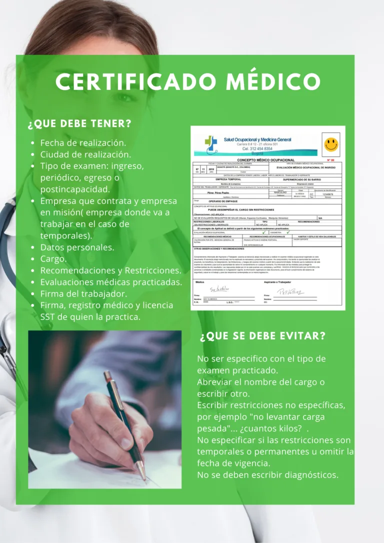 También se deben llevar las incapacidades, y cartas de recomendaciones entregadas anteriormente; este examen debe generar un documento en el que se registren restricciones, recomendaciones, vigencia de estas y si requiere o no reubicación, todo esto escrito de manera clara y específica.